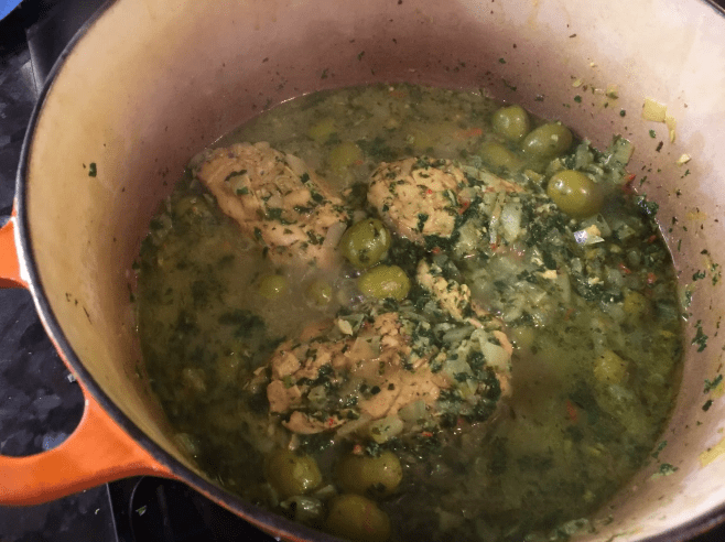 The first thing to add out of these great flavours are the olives. These can cook for longer than the other ingredients here and it’s nice when they soften up a bit. — With that in mind, about another half an hour’s cooking is needed before you add the preserved lemons. — Cook the lemons for about 10 minutes. You only really want to use the skin of the lemons, which should be rinsed off to get rid of excess salt. — Now throw in all those lovely fresh herbs, as well as the fresh juice of two slices of lemon, then simmer it down for a little while, until it starts to thicken up. A good guide is for the chicken to look well coated in the sauce when you lift it out of the pot. You don’t want it as thick as curry, more of a thick soup’y consistency.