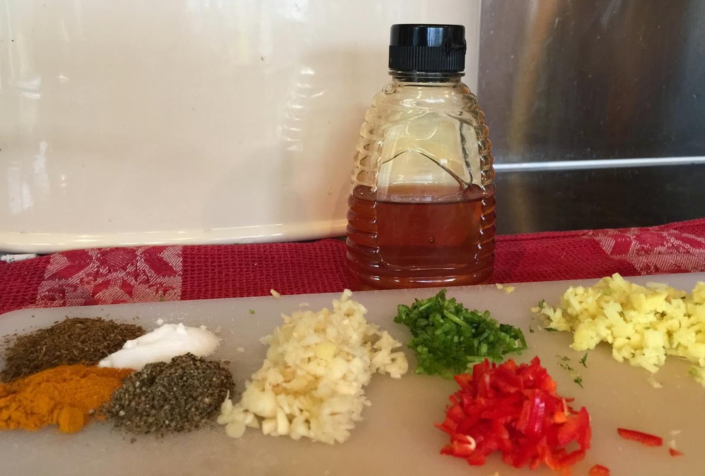 First, prepare the marinade. It’s simple really, just chop it all and chuck the chicken in. If it doesn’t seem to be coating the chicken properly, a little more olive oil is never a bad thing. — I decided that a chilli would give it a nice warmth, and also adding honey and lemon juice meant that the marinade was a bit more liquid, as it seemed a bit thick otherwise.