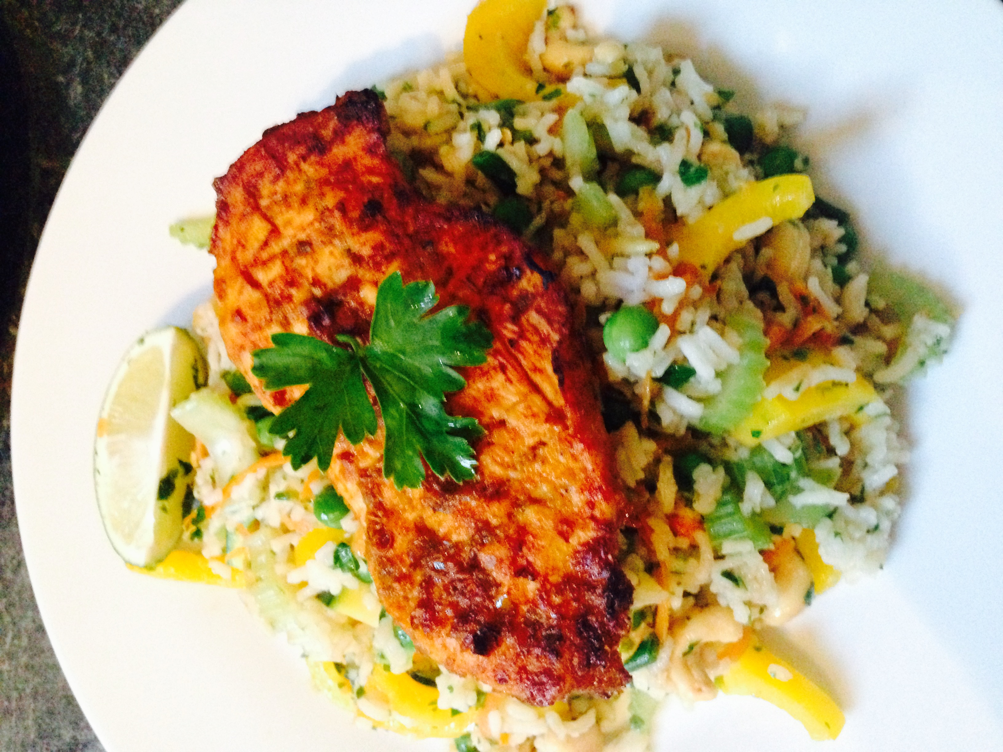 Now get the mix out onto plates, and put the lime to the side to present. Then get the chicken out of the grill and place it atop the rice, get a sprig of parsley and place it on top.