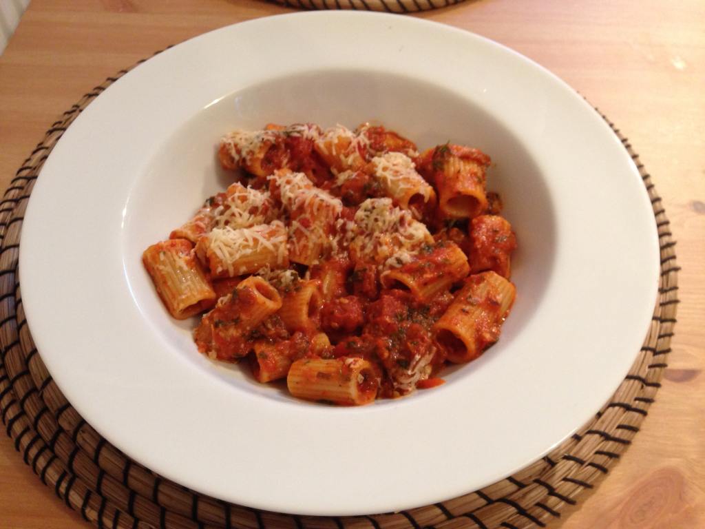 Once it’s cooked, turn the heat down and add the vegetable mush, along with your tomato puree, and cook for about a minute. Then, chuck in the chopped tomatoes and mix.