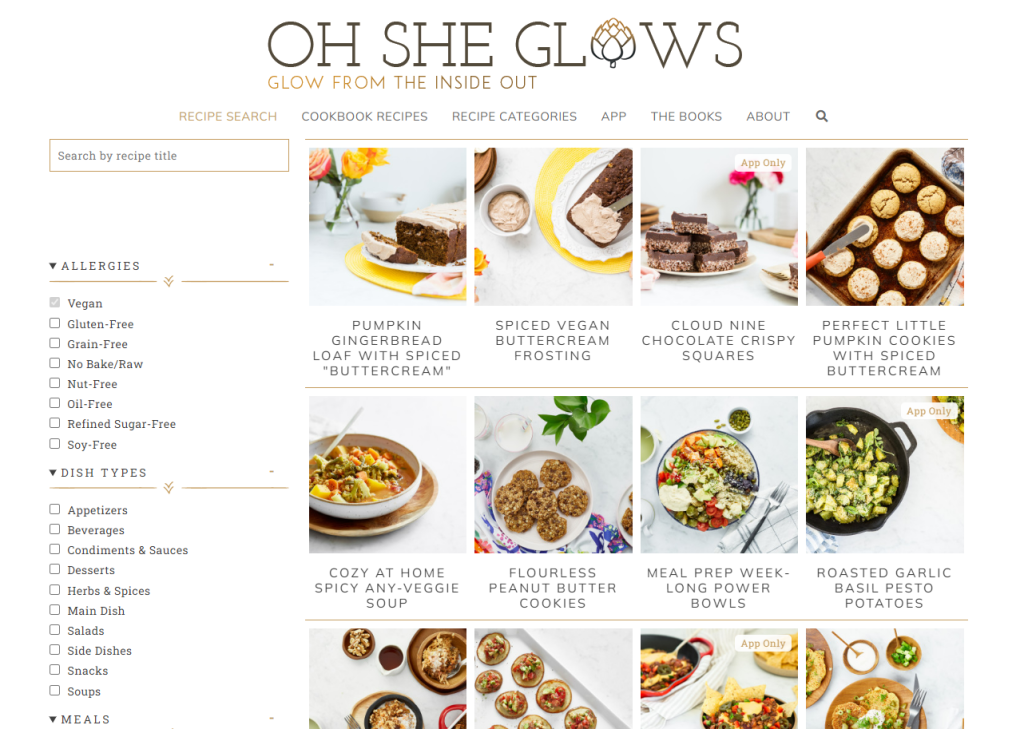 - “Oh She Glows” is a vegan food blog with a focus on nourishing, plant-based meals and allergy-friendly recipes. There’s a mix of sweet and savoury recipes to choose from, all accompanied by in depth and easy guidelines.